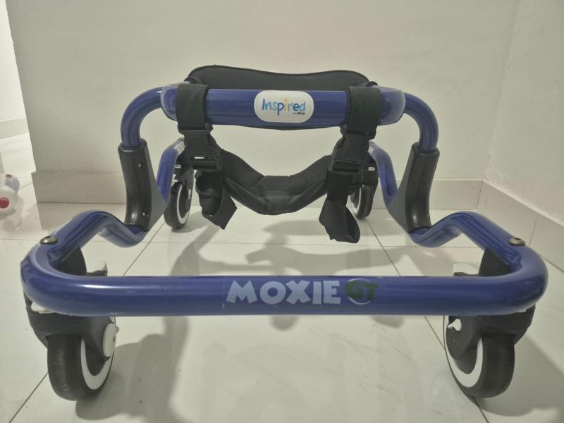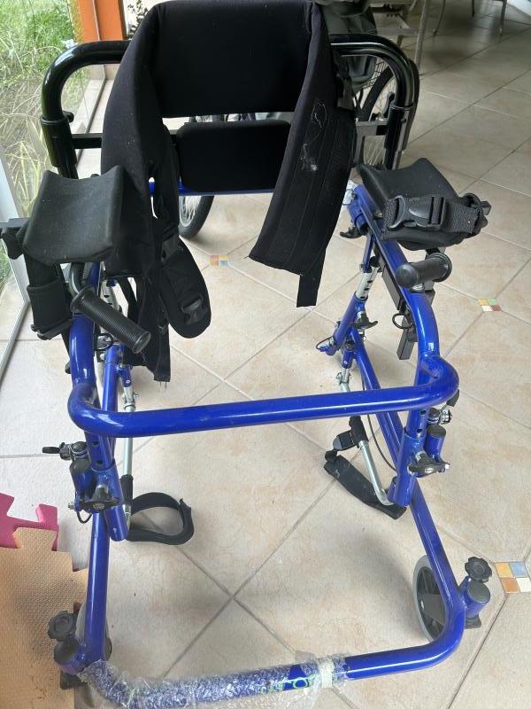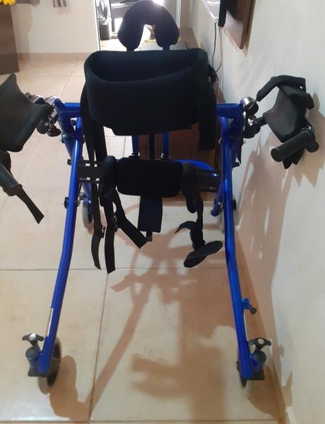 Andador com sustentação de quadril e sustentação de tronco e barra para não trançar as pernas. Estado novo.