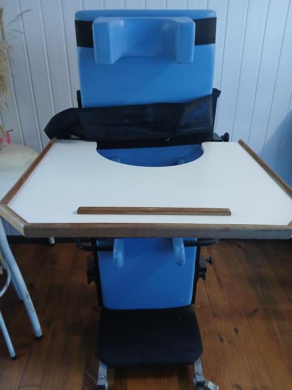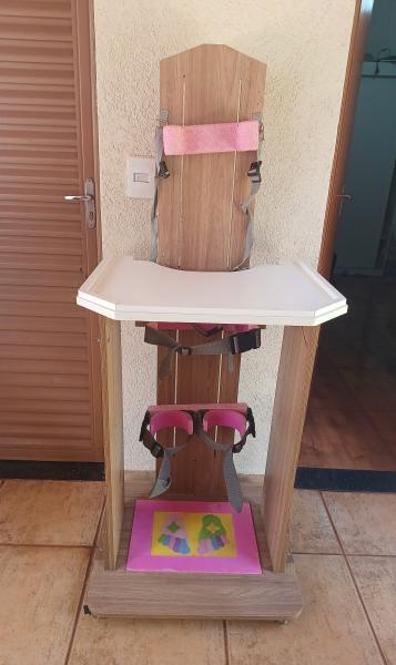 Parapodium posicionador vertical com rodinhas de transporte e mesa de atividades. Em perfeito estado sem peças faltantes ou avariado.